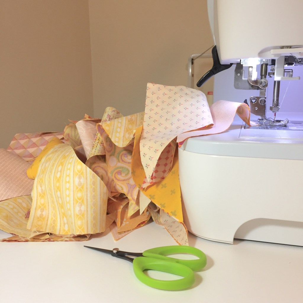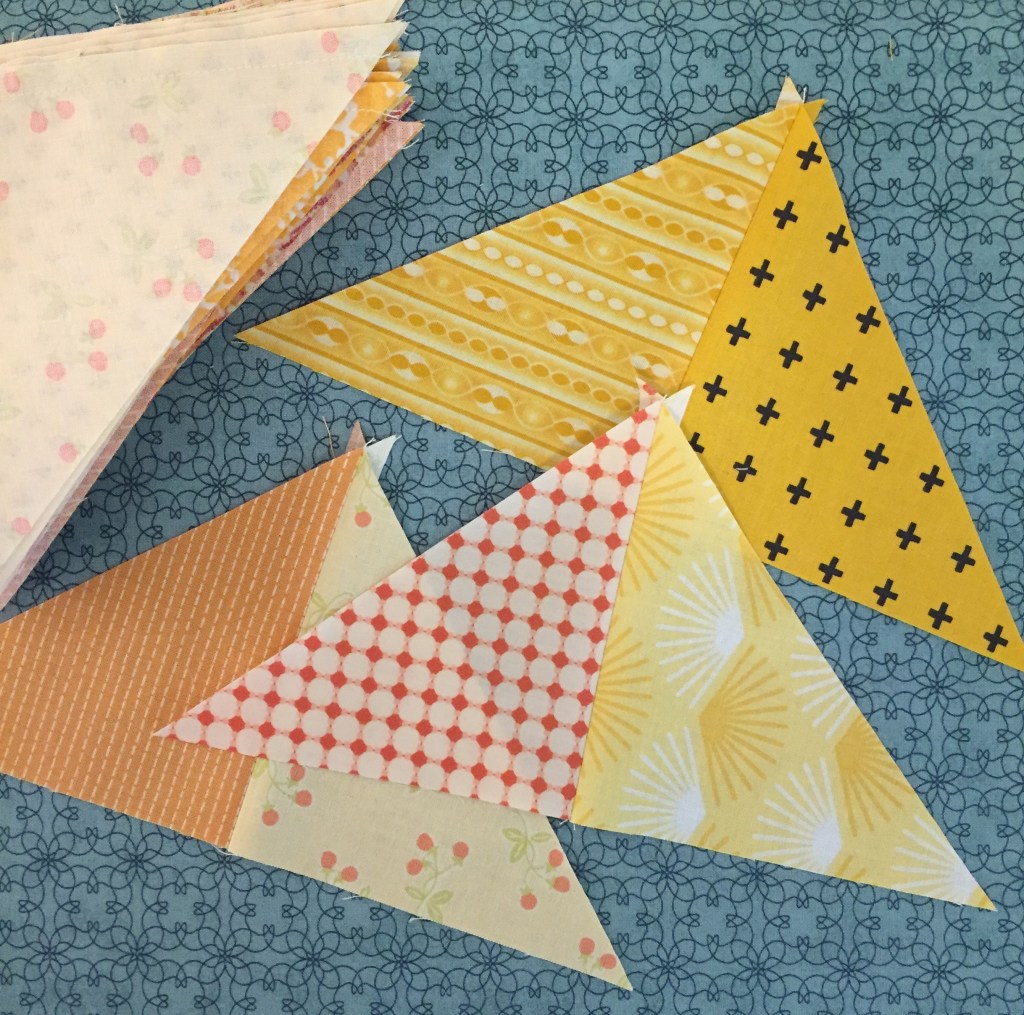 I’m continuing to make quilts with fabric I already have, and I chose a variety of golden yellows/oranges for this one. After cutting fabrics, I set to chain piecing (bias edges were present) and within 35 minutes I had 96 triangle pairs sewn.