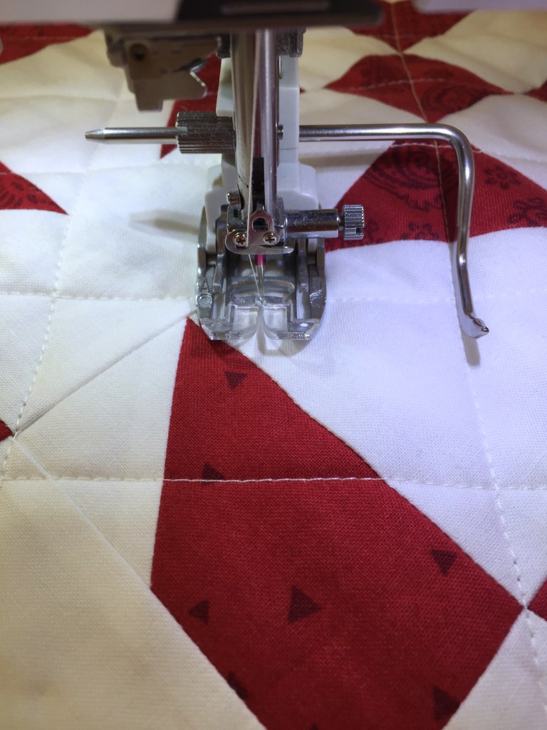 Longarming, unfortunately, isn’t always in the budget and this quilt wasn’t very big so I decided to quilt it myself. I quilted a crosshatch pattern—using my hera marker I marked every three inches and sewed on the line with a 3.0 stitch length. I used my guide for the in-between rows so I’d have less to mark.
