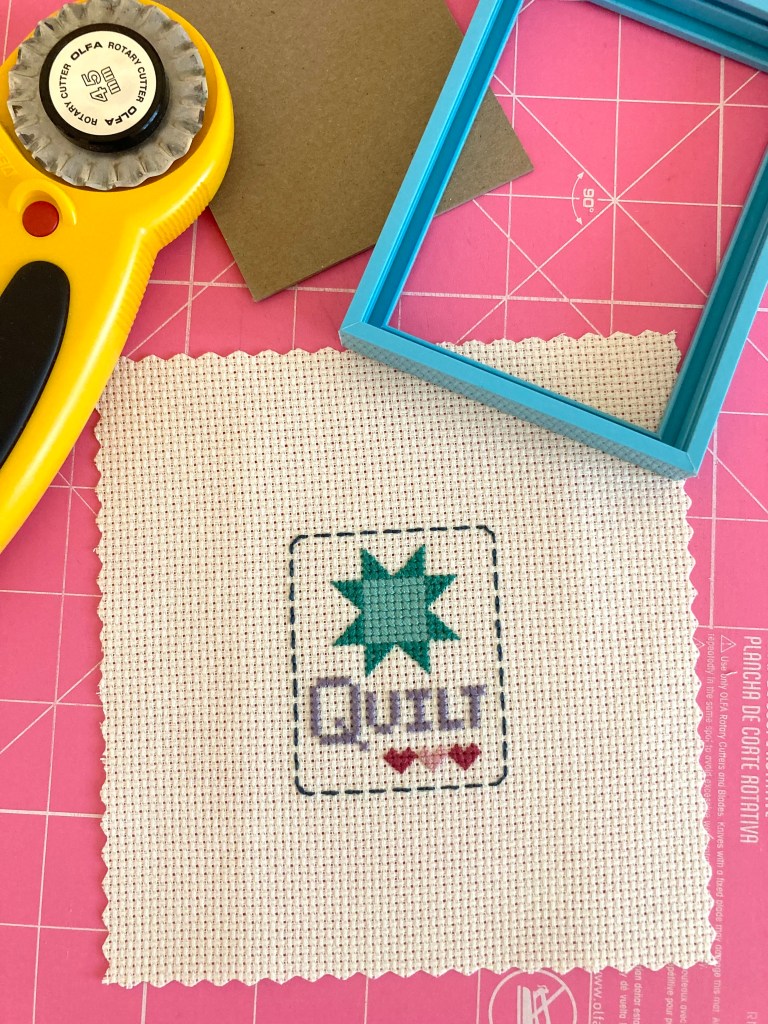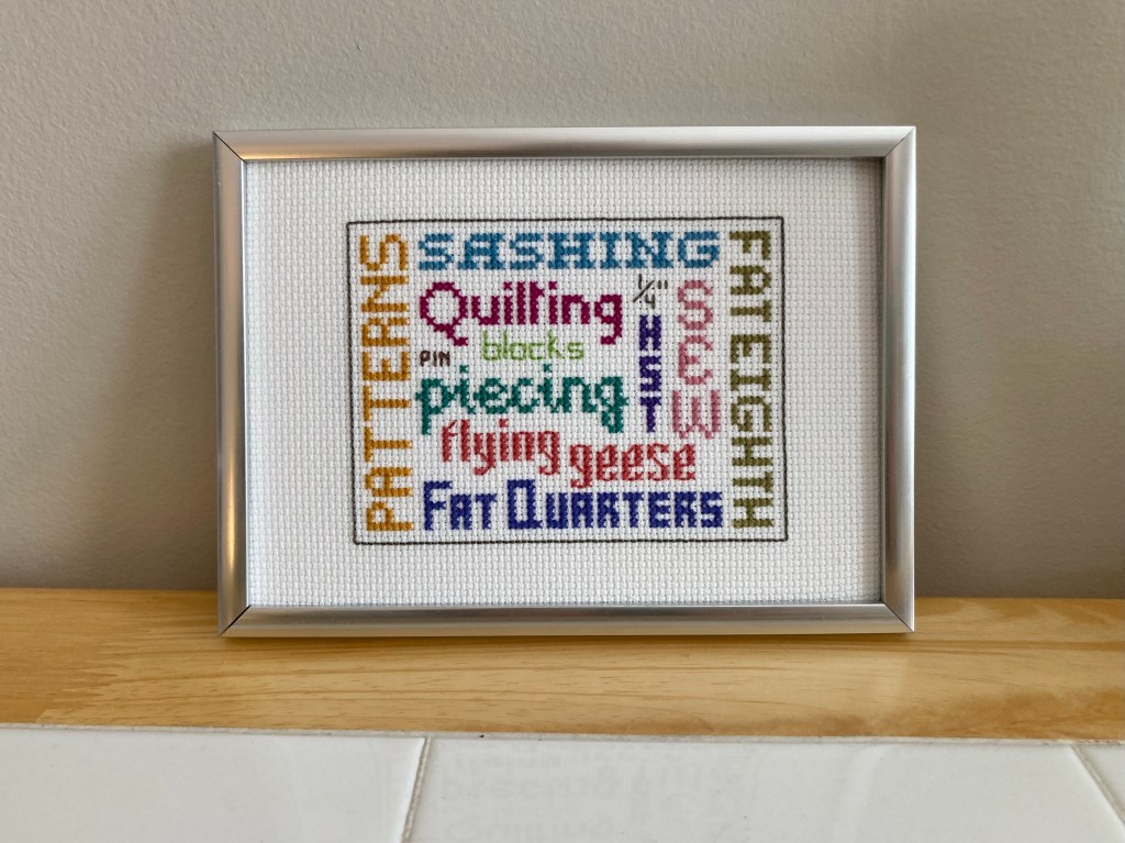 As a bonus, Quiltology I finishes at 5 5/8″ W x 3 3/8″ H (stitched on 14 count Aida cross stitch fabric) making it a perfect fit for a standard 5″ x 7″ frame—so no need for custom framing.