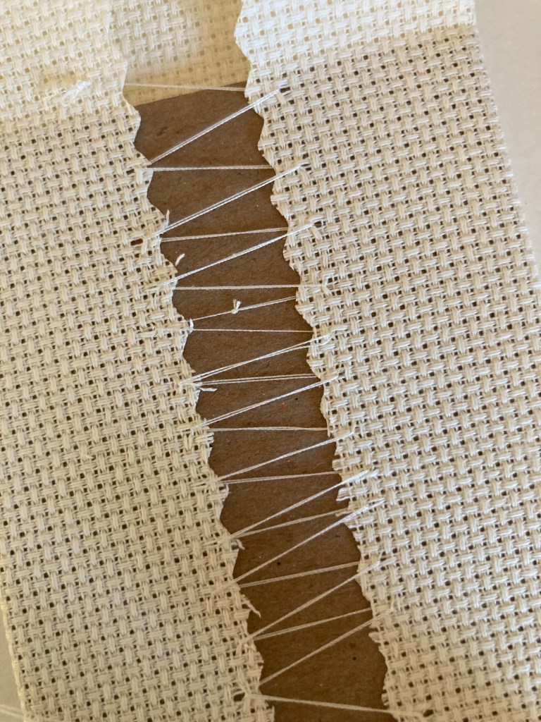 I threaded my needle as long as I could without tangling, but I did run out and had to tie another section on (it can be seen in the photo). Tie the knot tightly to prevent slipping. Also, make sure the knot isn’t where you’ll have to pull it through the fabric (it won’t go). Be sure to pull each stitch fairly tight, as you want it taut.