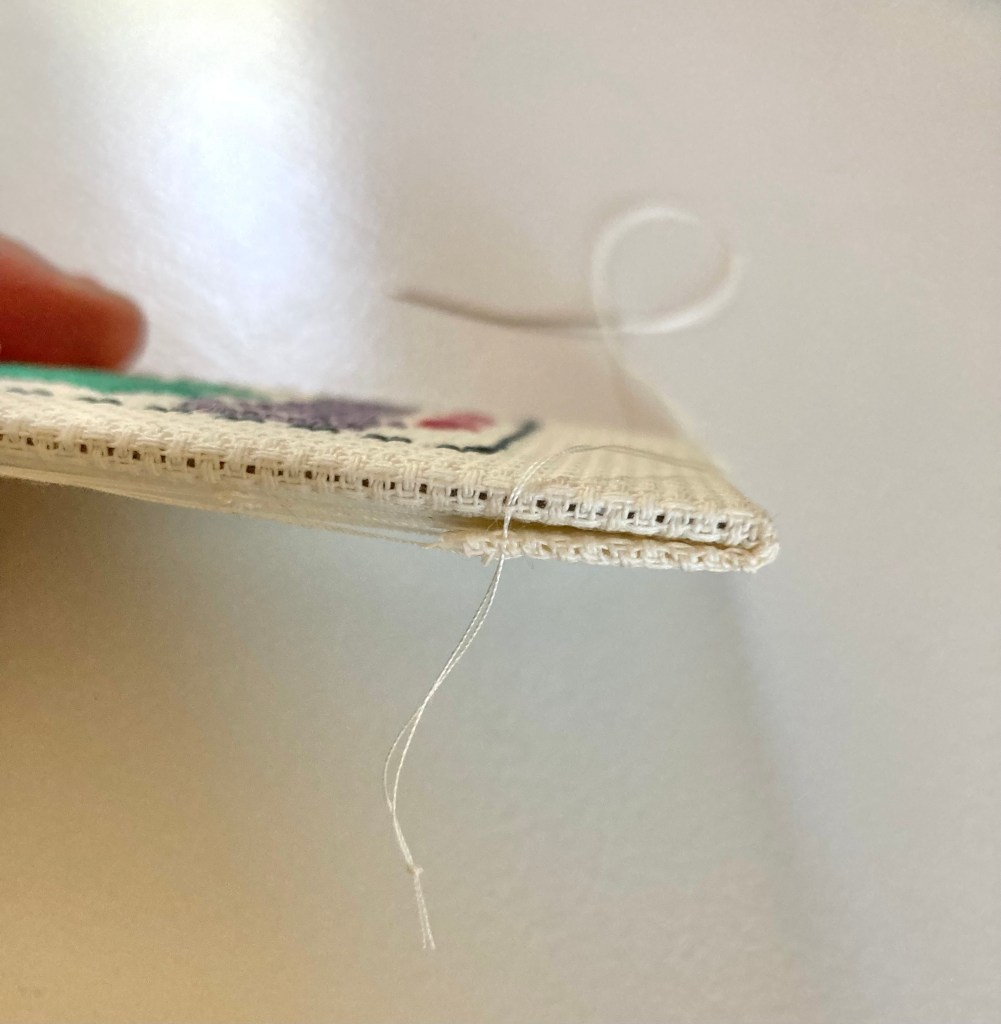 Once the sides are complete, don’t knot your thread just yet. Put a few stitches in the to-be-folded-over section to help it stay in place, making it neater when folding later. You can see the stitches below.