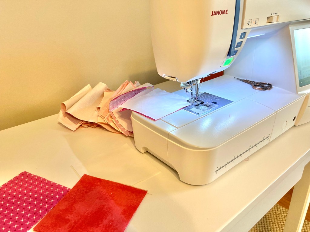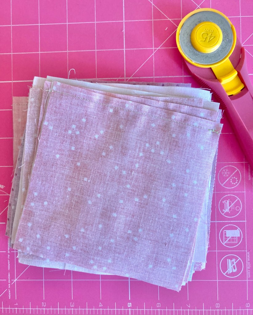 While clearing out I found several pieces in the pink family that could be turned into a quilt. That said, I gathered everything that coordinated along with pieces of neutral solids and got to work. Collecting and deciding on fabric is one of the funnest parts of quilting. 🙂
