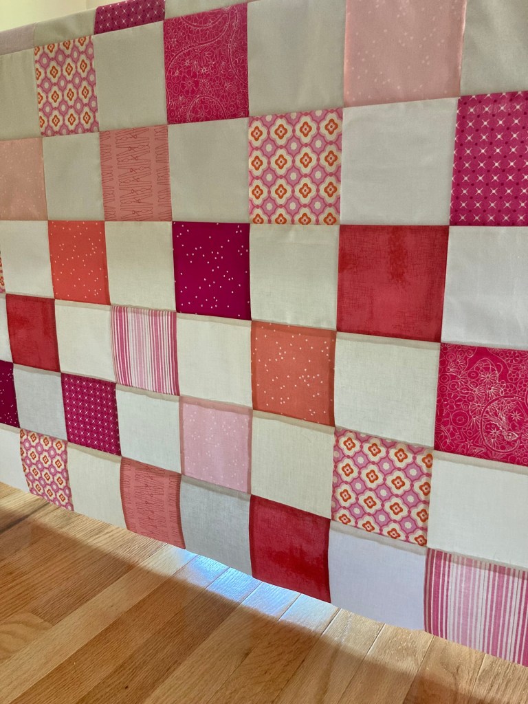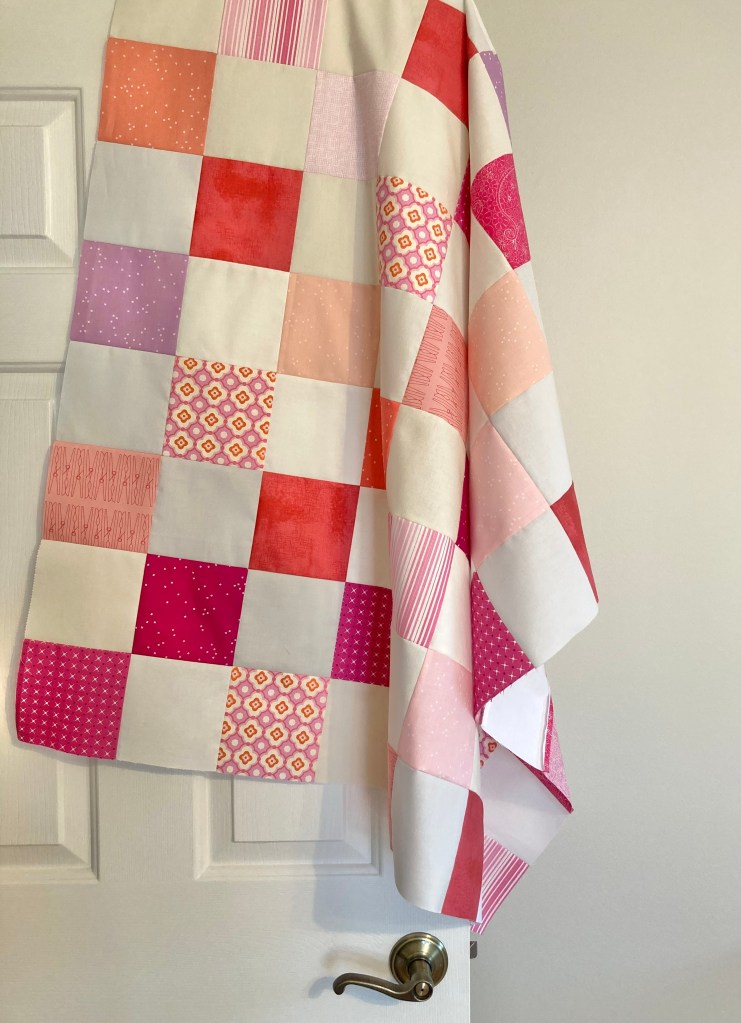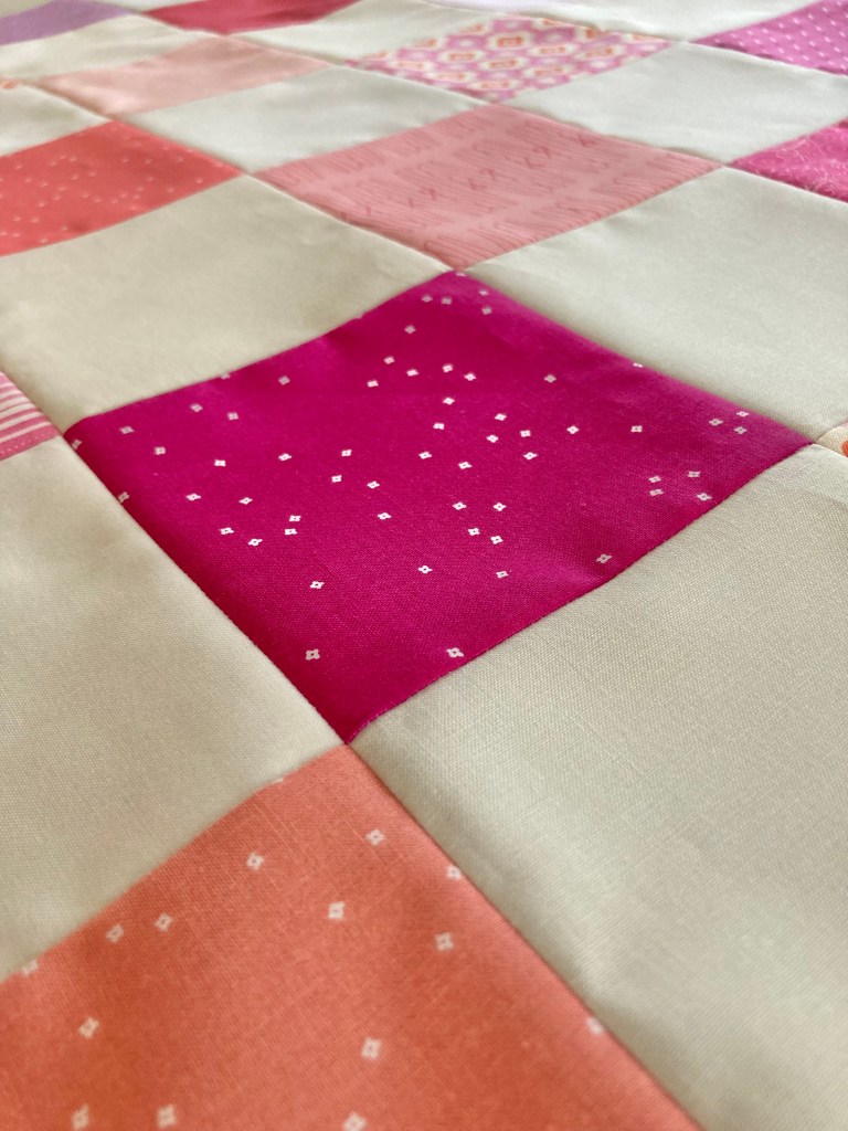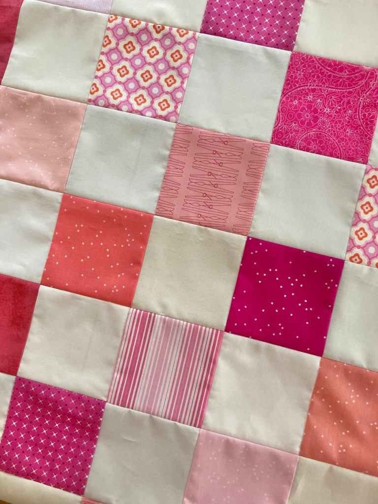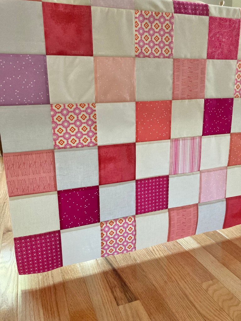 I’d settled on making a simple patchwork baby quilt top using 5″ square cuts. Easy and cute!