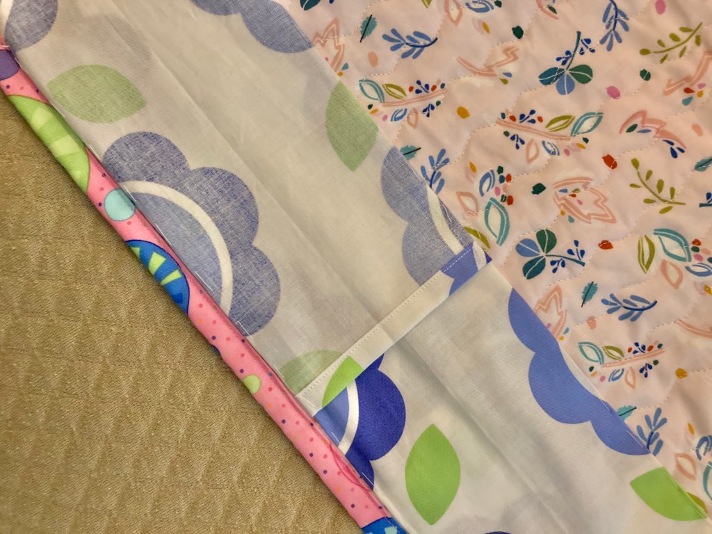 After all that, I decided to change my quilting design. Instead of sewing every line horizontal, I quilted the same distance apart vertically making squares. I wasn’t sure I would like it, but I do. I think the puffy little squares are cute and compliment the design.