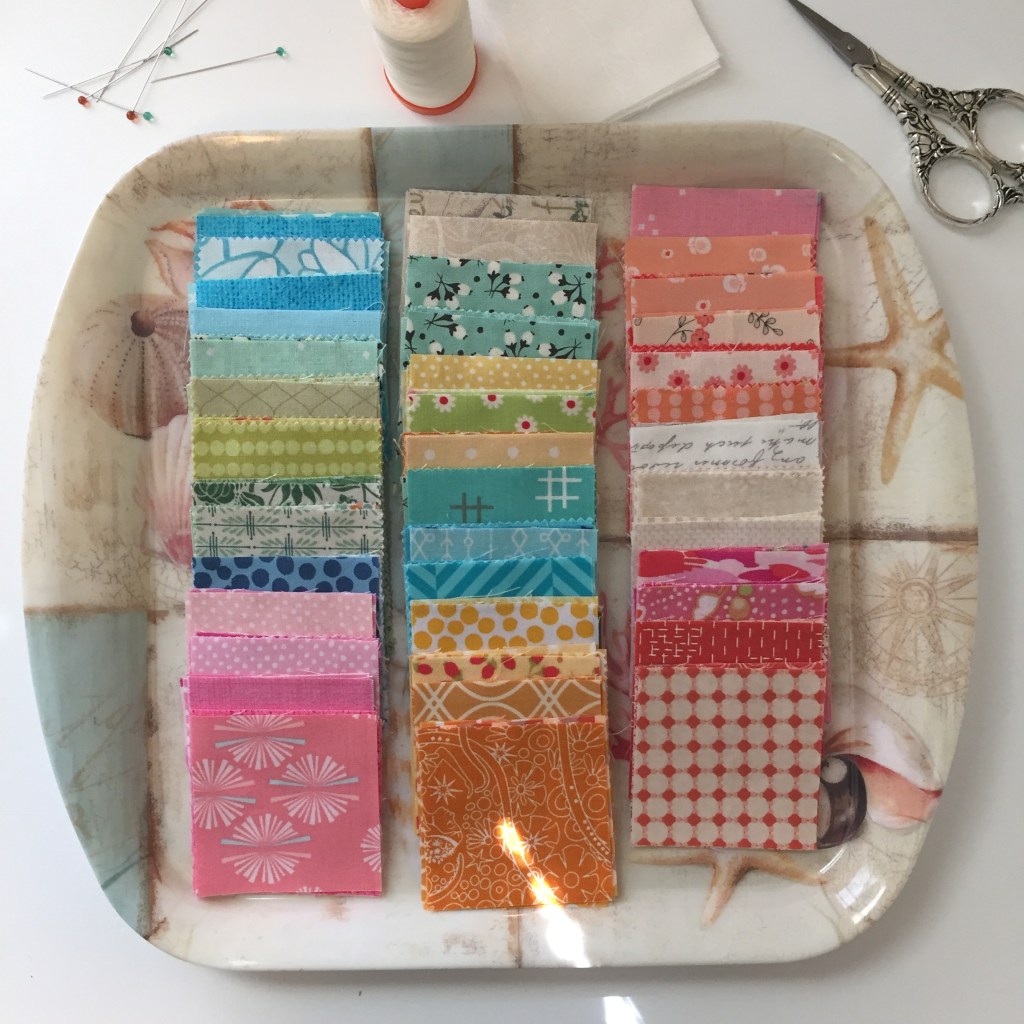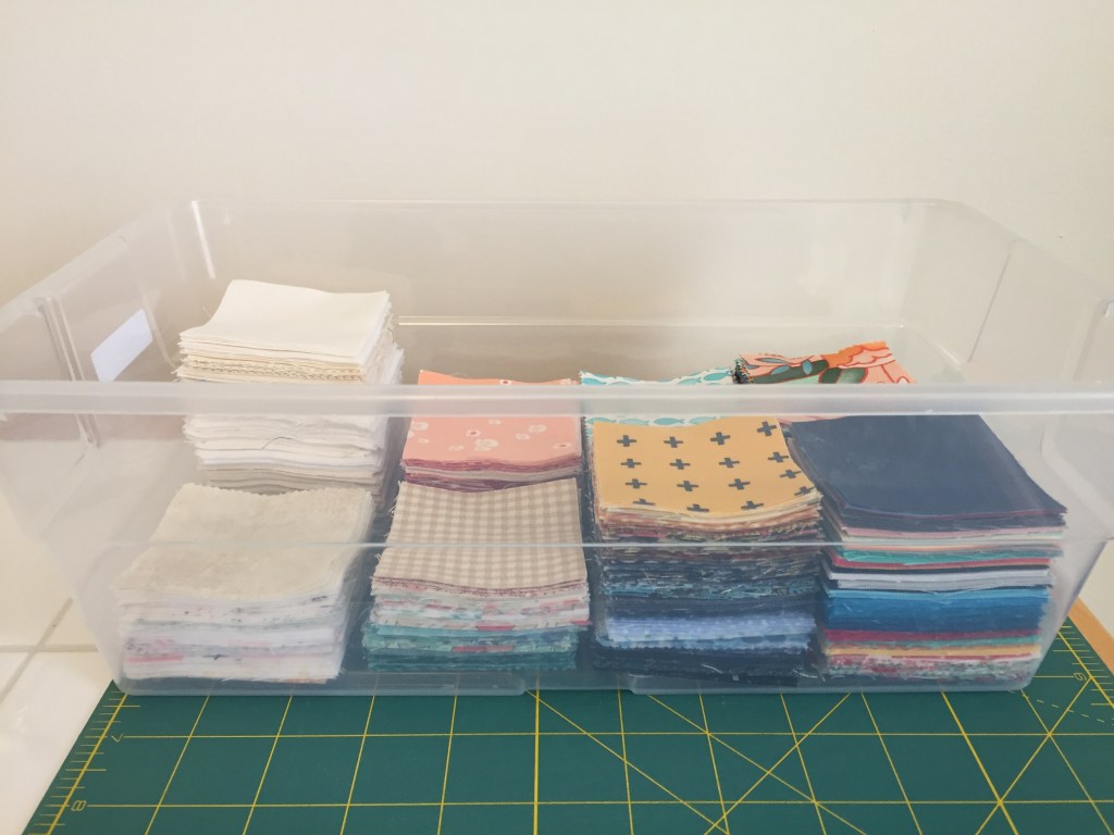It doesn’t look like I had much, but I got most of what I needed from what was already cut. How many squares did I need? 660! A lot. This was a really fun step, but it was kind of perpetual…as an example…I would be one square short of orange, so I’d have to cut a strip from a fat quarter for it then I’d end up with more orange in my box. That said, the next picture doesn’t look like I made much of a dent, but I really did.