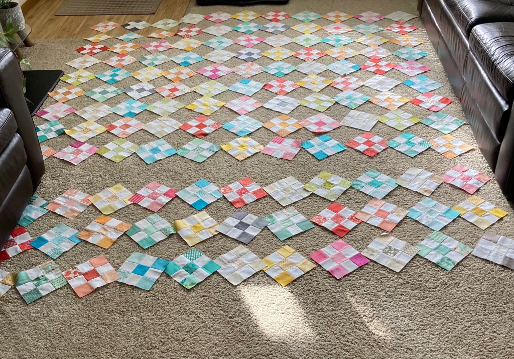 In mid-November, all my nine patch blocks were finished. I barely had room to lay them out, but I managed alright. Next, I labeled rows accordingly then tackled the task of sewing this huge beauty together.