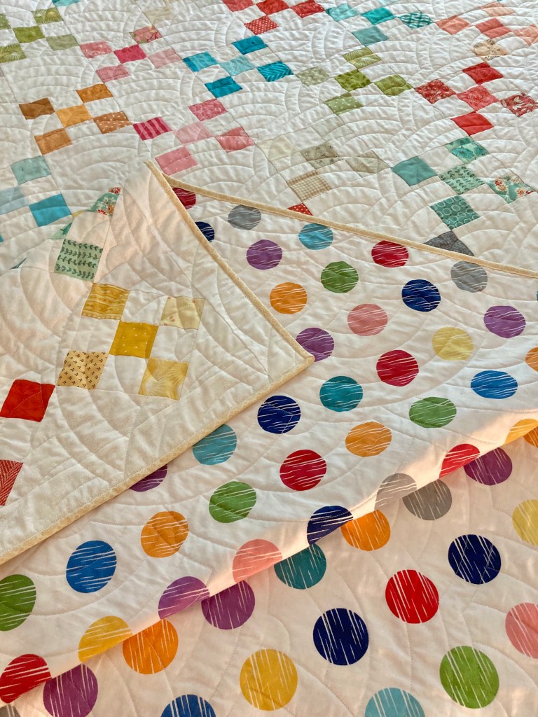 EQ calculated the finished size of this quilt approximately 97″ x 106″. Mine always come up a bit short, so my finished top measured 96″ x 104 1/2″. Since I’d wrestled with roughly 9 yards of fabric when piecing the backs of my kid’s quilts, I wanted to avoid that this time so I purchased Windham Fabrics Multi-colored Dots by Whistler Studio in 108″ wide. I think this fun fabric corresponds nicely with the colors on the front. And I’d never purchased wide backing fabric before, so this was a first.