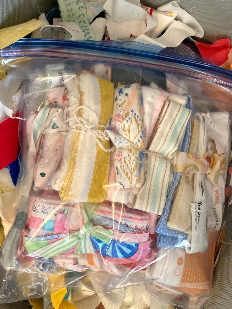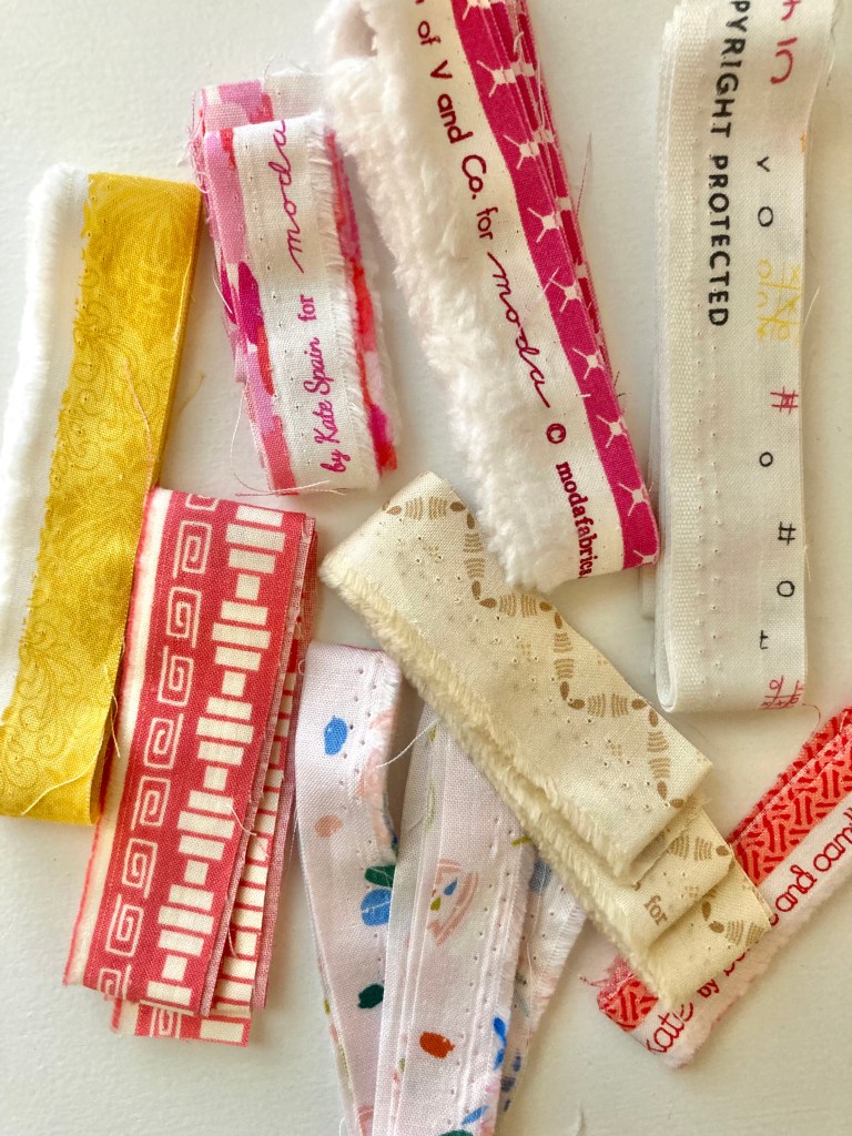 Another bonus to saving and using selvages is that they’re really easy to store. I just bundle a few together, place them in a large zip-lock bag and keep it in my scrap bin. It doesn’t matter that they’re creased and wrinkled, just press and trim when needed.