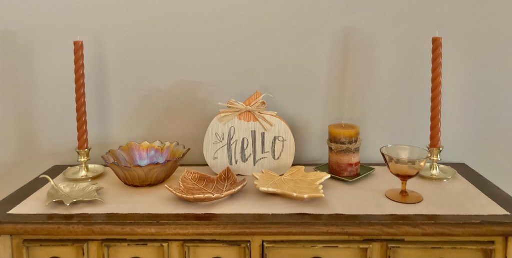 With the fall season approaching, I’d decided to create an autumnal tablescape for my sofa table. Since June I’d been thrifting, something I’d never done much of before, looking for pretty and elegant items to coordinate with things I already had.