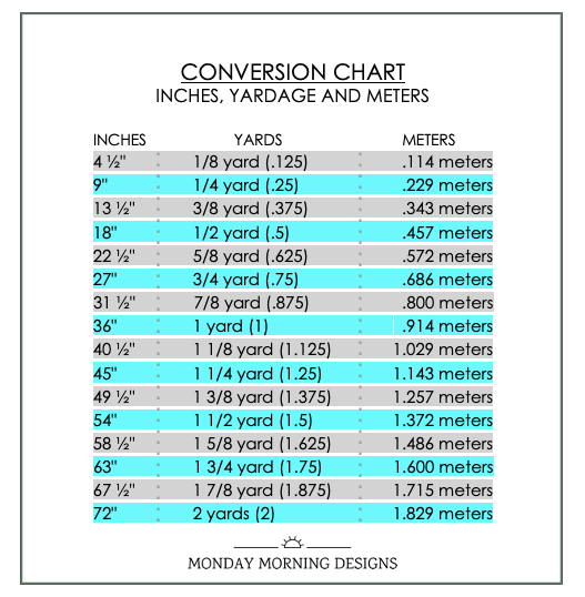 Use this easy-to-read chart as a quick reference for converting your fabric from inches to yards, yards to meters—whatever way you need!