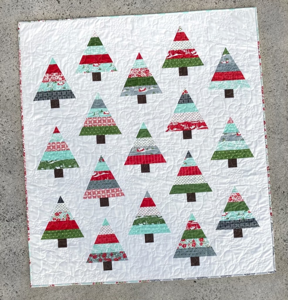 This festive woodland tree pattern requires your favorite holiday jelly roll, some brown fabric and background yardage.