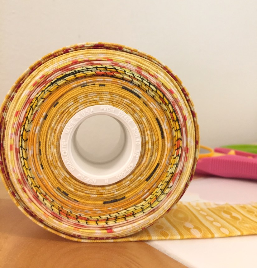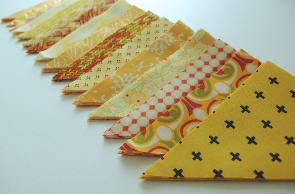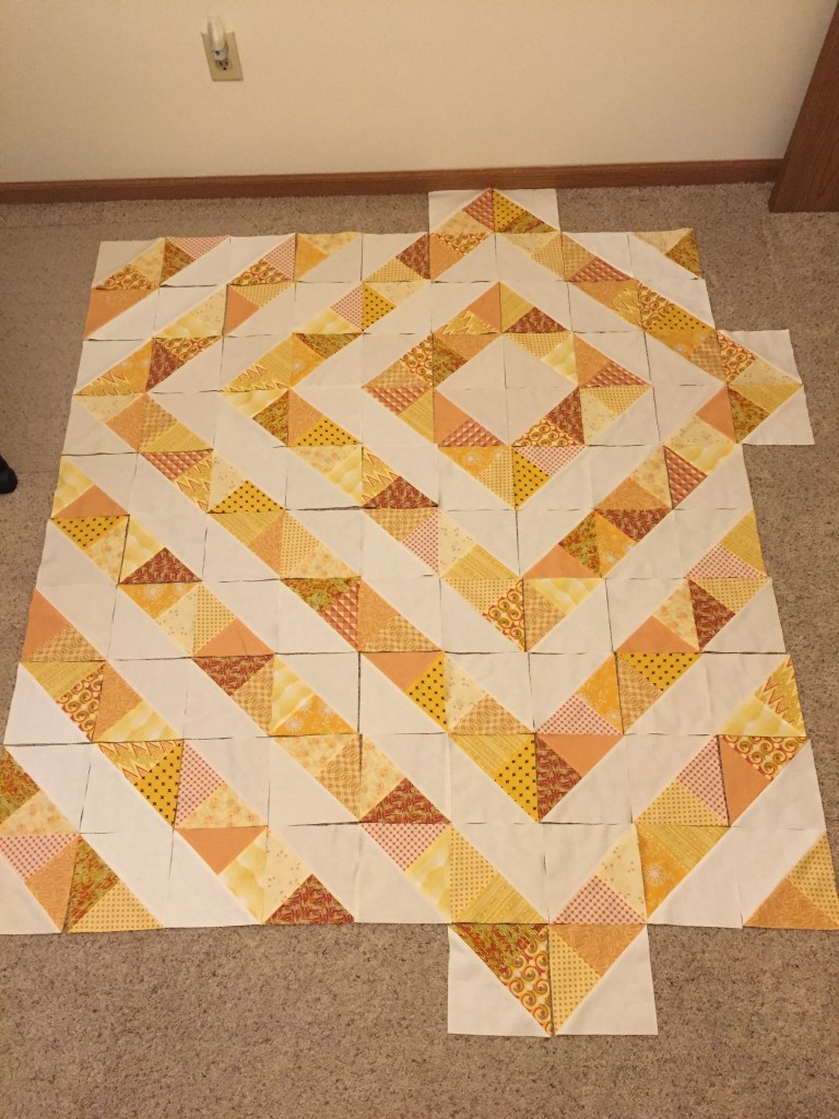 I’m still sewing with fabric I have on hand, and luckily I had enough golds and yellows in my stash for this project. I used 16 different prints to avoid too often of a repeat. I also had approximate one yard sections of solids for the background so I blended three different colors, Kona Bone, Kona Snow and Bella Wheat. I placed them in symmetrically so mixing the colors worked.